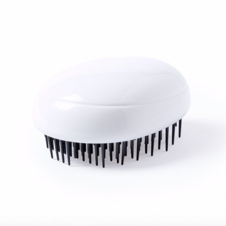 Plastic round detangling hair brush. Made in a simple white color and great for color full logos. Hair brush with circle design is a great way to keep your name in minds.